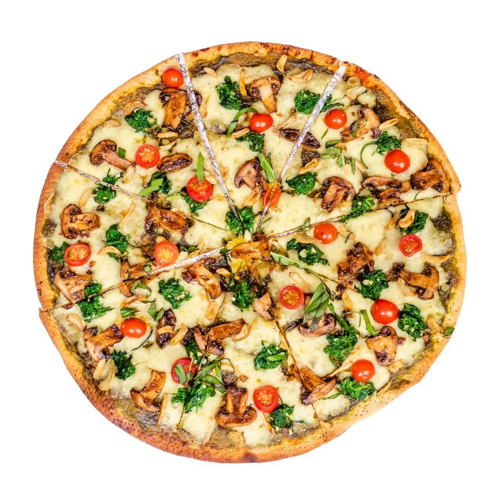 Fresh basil pesto sauce, melted mozzarella, tender broccoli florets, crisp red onions, juicy cherry tomatoes, roasted garlic, and a sprinkle of chili flakes — every bite of the Green Garden Pesto Pizza is herbaceous, bright, and full of garden-fresh flavor. Perfect for pesto lovers craving a light yet satisfying gourmet pizza.