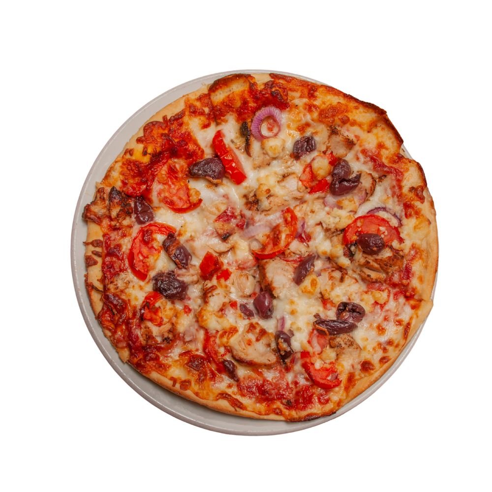 Enjoy tender grilled chicken, fresh spinach, red onions, Kalamata olives, rich tomato sauce, and creamy feta cheese — a mouthwatering mix inspired by sunny Mediterranean kitchens. -